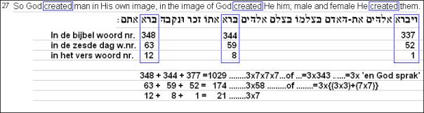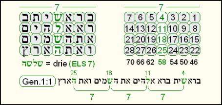 7x7x7=343(=337+6) Zowel de drie als de zeven hebben een belangrijke symbolische betekenis in de bijbel. De bijbel schrijver lijkt steeds een verbinding tussen de 3 en de 7 te willen leggen, niet alleen rekenkundig, maar ook optisch. Want door samenvoeging van deze twee cijfers ontstaan de getallen 37 en 73, die we als factoren van 2701, de gematria van Gen.1:1, hebben leren kennen. Het woord ‘waarheid’ met getallenwaarde 441 heeft dit ook in zich, want 441=21x21 of (3x7)x(7x3) Deze ontbinding in factoren heeft een duidelijke optische relatie met de factoren van Gen.1:1. (37x73) Gen.1:1