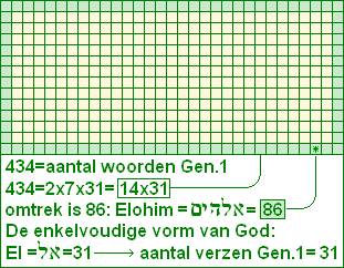 11. Structuur hoofdstuk 1. Gen.1:1-31 De verzen, woorden en letters van het eerste hoofdstuk van de bijbel blijken te zijn ingedeeld met de getallen 3 en 7. Dit zijn de getallen die een hoofdrol vervullen bij de opbouw van de priem tabel van Perfecte Priemgetallen. De indeling van de 31 verzen van het eerste hoofdstuk is als volgt: 3 - 7 - (3x7) 3+7+21=31 Hierbij haalt de 21 zijn informatie uit de andere twee groepen. De eerste groep van drie verzen vertelt ons iets over het aantal woorden. Deze drie verzen bevatten namelijk 3x3x3=27 woorden. De tweede groep van zeven verzen vertelt ons iets over het aantal letters, deze verzen bevatten namelijk 7x7x7=343 letters. Deze twee groepen vertellen over het aantal woorden en letters in de derde groep van 21 verzen, maar dat vraagt van de lezer enig inzicht in de bijbelse rekenkunde. Om daar inzicht in te krijgen kunnen we het beste naar het eerste vers van de bijbel kijken: Gen.1:1
