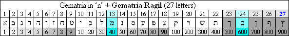 het getal 26, het CV van 5+6+7+8=26 Als we deze vier getallen nog een andere bewerking geven dan is het resultaat 1680, het CV van een schrijfwijze van Christus zoals die in Matt.1:1 voorkomt: 5x6x7x8=1680 De waarde van de mem als sluitletter, van de 24ste letter, is 600; in factoren is dat: 600=1x23x3x52 1+8+3+25=37 Het wezen van de 24ste letter is dus: 600