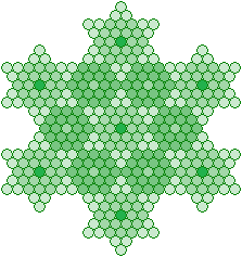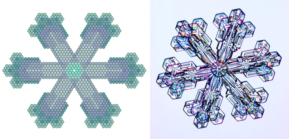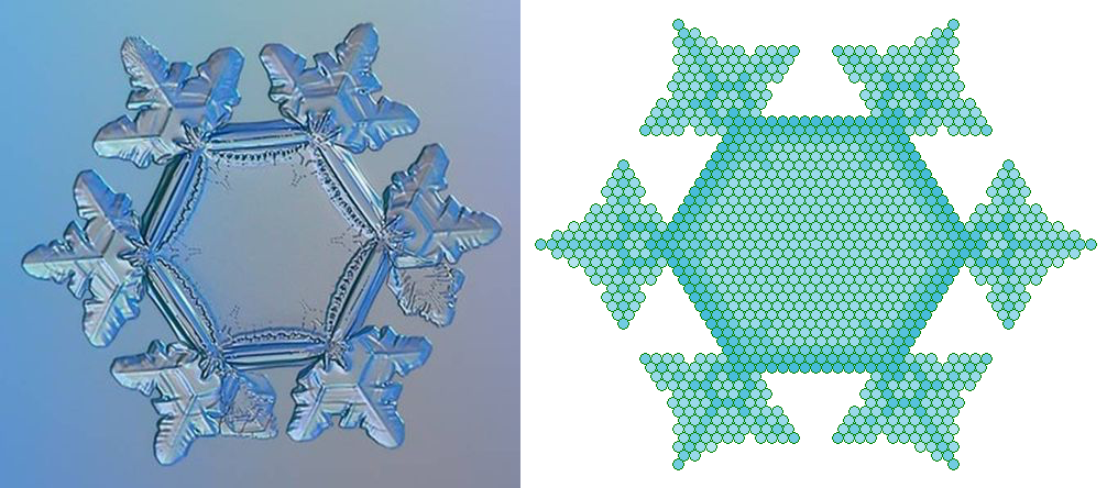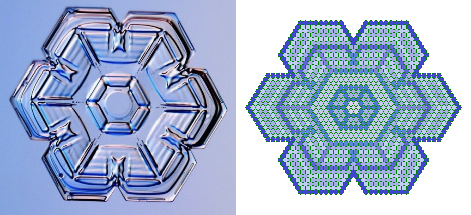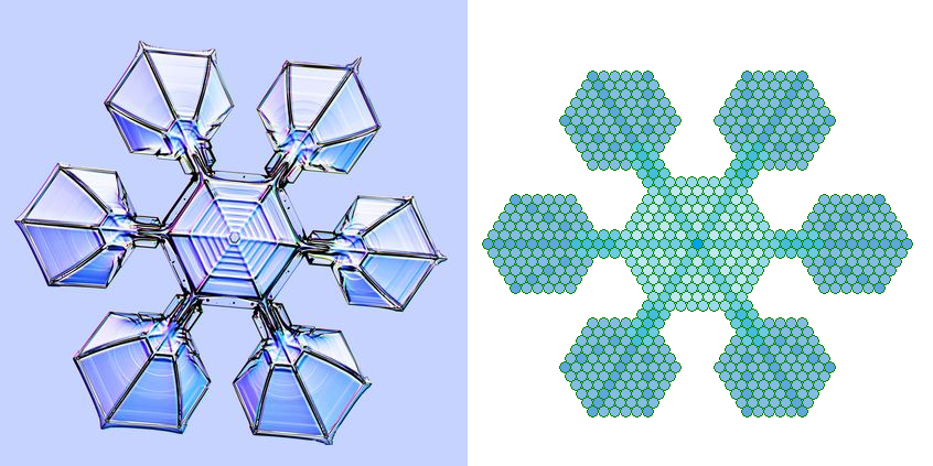 Deze foto's zijn gemaakt door Alexey Kljatov. Zijn site kan je hier vinden. Dr Ken Libbrecht heeft onderzoek naar sneeuwkristallen gedaan. Een reportage over zijn onderzoek kan je hier vinden. Maar bij het maken van afbeeldingen van getallen zal ik me in het algemeen beperken tot structuren die uit Hexagrammen en hexagons zijn opgebouwd. Wel moeten we voorzichtig zijn met dit soort afbeeldingen, want als je van een willekeurig boek de letters omzet in cijfers, dan zal je ook daar getallen vinden die je met een sneeuwvlok structuur kan tekenen! Het blijft opletten hoe de mathematische structuur is en hoe de structuur van de tekst is.