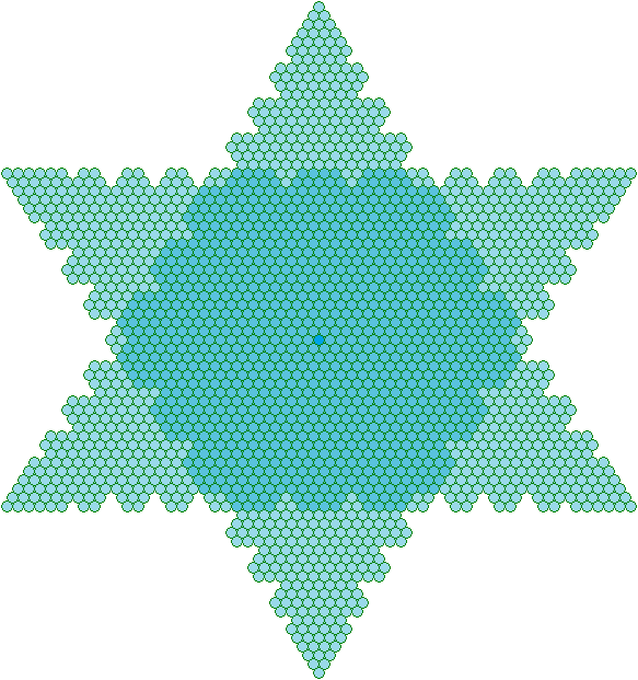 De driehoek van 7 met 28 éénheden is het uitgangspunt om de Davidsster met 37 éénheden te maken. Als we bekijken hoe het Hexagram wordt gevormd, dan zien we dat het eerste Hexagram of Davidsster in beginsel in één cirkel aanwezig is. De tweede 13 éénheden heeft, de derde 37 en de vierde 73. De formule om het aantal een heden van de Davidsster uit te rekenen (H=Hexagram en D=Driehoek) is: H(n+1)=12xDn+1 Dus: H(3+1)=(12xD3)+1.....H4=(12x6)+1=72+1=73 Hoewel er ook een Hexagram kan worden getekend met 7 éénheden, deze voldoet niet aan de formule. En wiskundigen houden niet van afwijkingen van de regel. Maar toch is er ook met zeven éénheden ook een Davidsster te zien en te tekenen, ook al moet die gekanteld worden. Ook het eerste Hexagram kan met de formule worden uitgerekend. In dat geval is n=0: H(n+1 )=(12xDn)+1dus H( 0+1)=(12xD0)+1.....H1=(12x0)+1=1