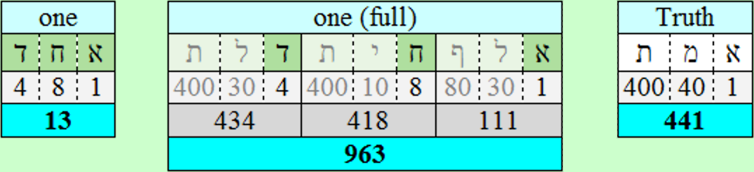 If we now look up all the divisors of 963, excluding the number 963 itself, then the sum of those divisors is 441. The number 441 is the CV of the word ameth, truth.