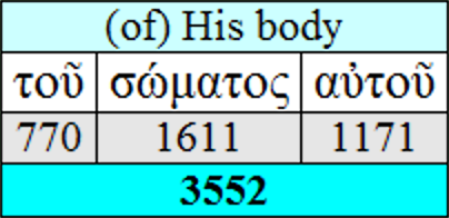 By the way, if you divide Jesus' CV (888) by 23 (pairs of chromosomes), the result is: 888/23=38.60869556, which corresponds to Jeshua's CV 386. John 2:21: But He spoke of the temple of His body. The last three words of John 2:21, τοῦ σώματος αὐτοῦ, (of) His body, together have the number value 3552: