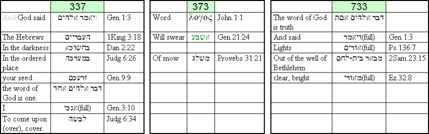 God said: 337, and 733: the Word of God is truth. The gematria and the symbols make the relationship between the Hebrew and the Greek langue visible. The gematria of the Greek word ‘logos’ (Word) is: Word= λογος=30+70+3+70+200=373