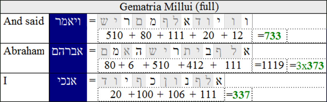 of God, Also the 22nd word of the bible ‘and said’, where God speaks for the first time in the bible, has with gematria ‘full’ the number value 733: