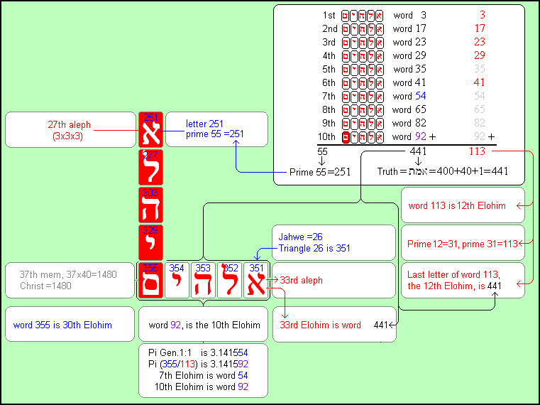 But let us go on with matrix 26. I took out the most important data; the image below is showing them. The ten word numbers of the word Elohim add up till 441, the number value of the word ameth, truth. 3+17+23+29+35+41+54+65+82+92=441 The 10th Elohim starts on letter 351, which is the triangle of 26, of Jahwe, the name of God. And this 10th word Elohim is ending on letter 355 (The 355th composite number turns out to be 441) The 'truth' of those 10x Elohim can also be expressed by the word numbers that are prime. The sum of these word numbers is: 3+17+23+29+35+41+54+65+82+92=113 And as you probably know the division of 355 and 113 makes the number of Pi, seven digits correct: 355/113=3.141592920.... The 10th Elohim begins with the 33rd aleph. Because the aleph is a representation of God we go to the 33rd Elohim; that happens to be word 441 (Gen.2:2 word 2). The text is telling there: And on the seventh day God ended his work......Probably there is not a more accurate number for Pi in the bible than this one with seven digits correct.