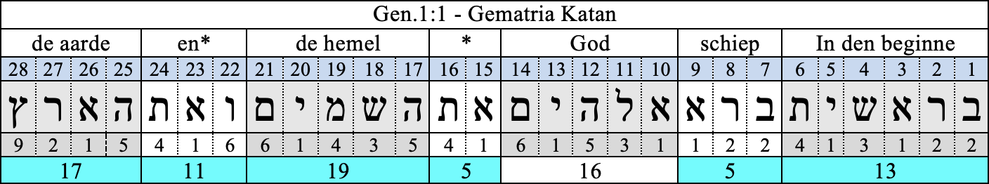 Het 6-1 patroon is op verschillende manieren in de bijbeltekst verwerkt. De scheppingsactiviteit wordt uitgedrukt in zes scheppingsdagen en één rustdag. Ook laat Gen.1:1 hier verschillende voorbeelden van zien. Door middel van priemgetallen wordt deze 6-1 verdeling zichtbaar gemaakt. Bij beide gematria methoden Katan en Ragil is dat 6-1 patroon in de zeven woorden van Gen.1:1 aanwezig. Bij gematria Katan zijn zes van de zeven woorden een priemgetal.