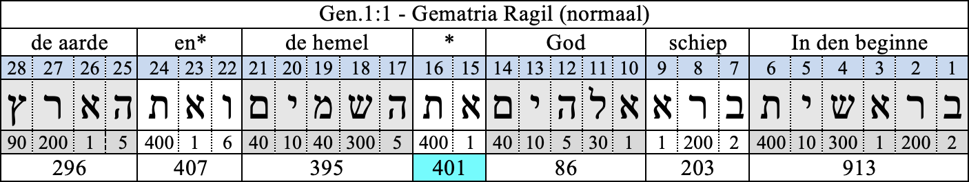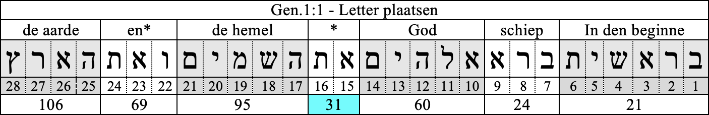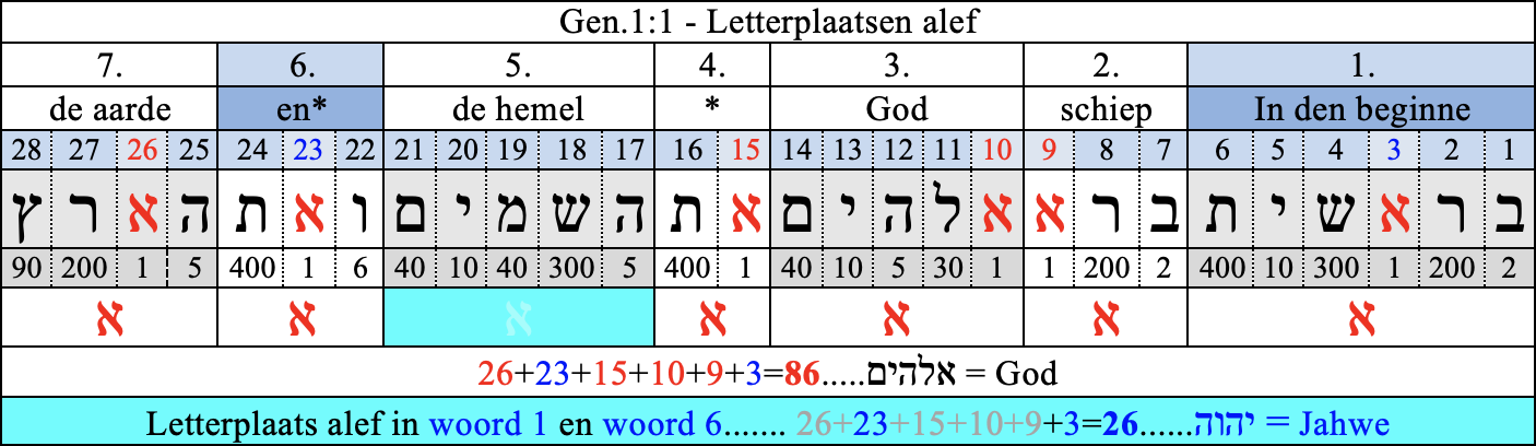 De verdeling van de zes alef’s over de zeven woorden geeft een vergelijkbaar patroon. Zes woorden met een alef en één woord zonder een alef. Het is God die de sabbat als rustdag instelt en zelf voldoet hij met zijn werk ook aan die voorwaarden. De bijbelschrijver heeft dit zorgvuldig in de tekst geweven. Als we naar de letterplaatsen van die zes alef’s kijken dan zien we dat God ook hier de touwtjes in handen heeft. De alef, de eerste letter van het alfabet, vertegenwoordigt God in de bijbeltekst. Dit vertelt het eerste vers.