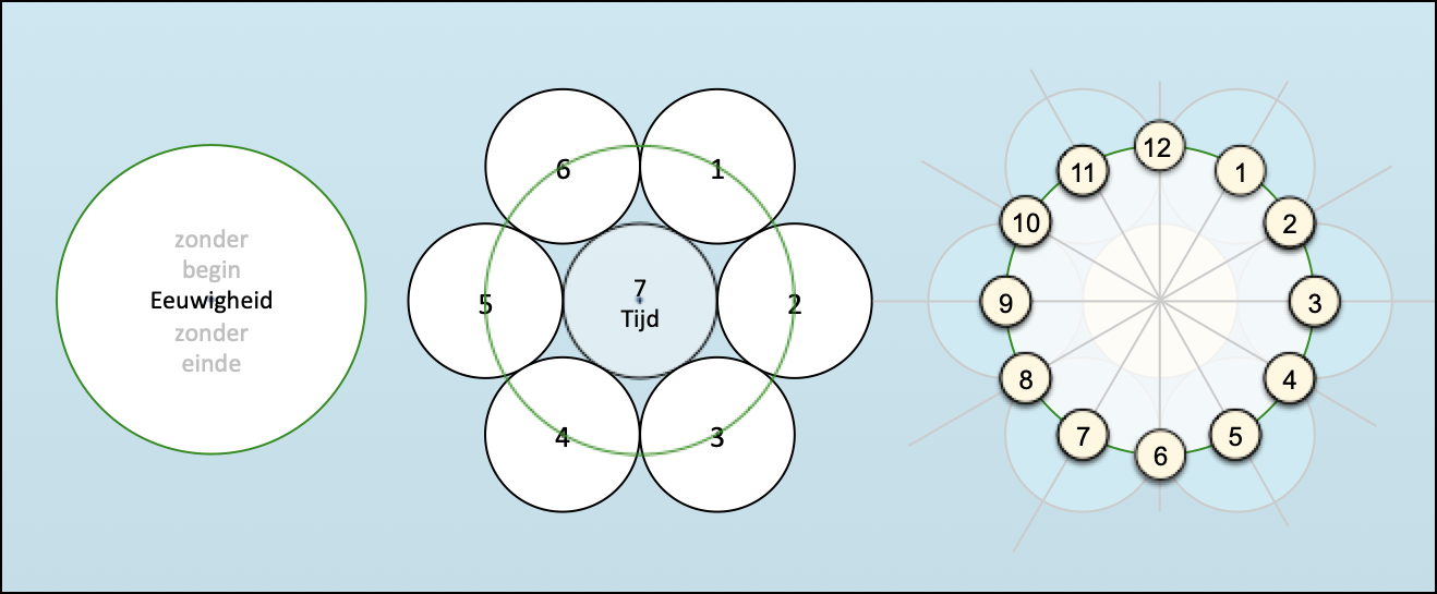 Deze zienswijze lijkt mij zeer logisch te zijn. Het lijkt mij een open deur om te zeggen dat de wijzerplaat van de klok ook hiervan is afgeleid. Met de cirkel als uitgangspunt, kan de klok met de twaalf uren worden geconstrueerd, zoals we die gebruiken om de tijd te meten. En trouwens, de som van alle delers van 24, het getal 24 zelf ingesloten, is: 1+2+3+4+6+8+12+24 = 60. Elk van de 24 uren heeft 60 minuten! De cirkel is zeer waarschijnlijk ook de basis van het twaalftallig stelsel. De 6 kleine cirkels verdelen de grote cirkel. de zevende cirkel verdeelt niet, deze is in 'rust'. Dit is het het mathematisch uitgangspunt voor de sabbath als rust dag.