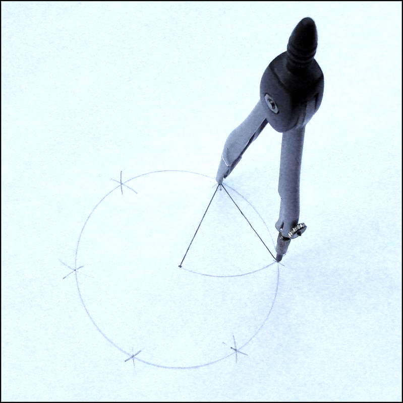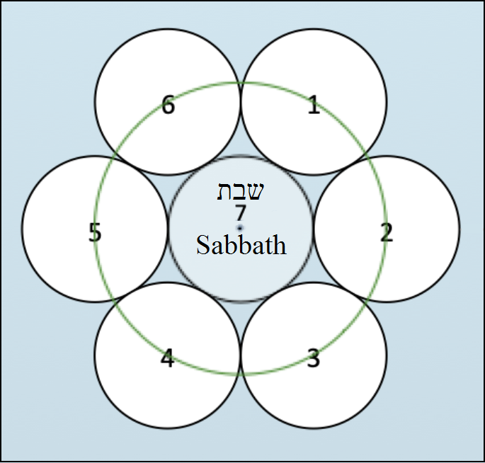 Dit kan ook op eenvoudige wijze zichtbaar worden gemaakt door zeven gelijke munten of cirkels tegen elkaar aan te leggen. We zien dat door de middelpunten van de zes buitenste munten of cirkels een grote cirkel getrokken kan worden. Deze wordt dan in zes gelijke delen verdeeld. De zevende cirkel speelt geen actieve rol bij het verdelen, en je zou kunnen zeggen dat hij in rust is. Ik denk dat de zes scheppingsdagen en de zevende als rustdag op dit mathematisch gegeven zijn gebaseerd. Dit wordt ook ondersteund door het feit dat de eerste zes scheppingsdagen in Gen.1 worden besproken, en de zevende, de rustdag in Gen.2, zodat ook hier een 6-1 verdeling in de zeven dagen ontstaat.