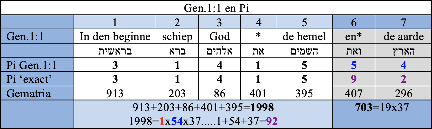 de Tenach heeft 305485 woorden. Woord 31415 staat in Ex.28:15 het 15de woord: We zien dan ook dat het getal Pi en ook andere getallen op verschillende wijzen in de tekst zijn geweven. Een andere reden dat met Gen.1:1 het getal pi is uit te rekenen, is het feit dat alles in de schepping op de ronde of bolvorm is gebaseerd. In de microkosmos zijn de atomen bolvormig en in de macrokosmos zijn zon, maan en sterren ook bolvormig evenals onze aarde. Al deze vormen zijn niet exact rond, denk aan de afplatting van de aarde bij de polen. Ook op atomair niveau zijn de banen van de elektronen niet exact cirkelvormig. Het is mogelijk mede een reden dat daarom het getal Pi in Gen.1:1 niet exacter is geformuleerd.
