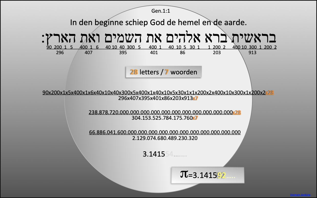 De getallenwaarde van het vers is 6283, hetgeen een cijferanagram is van 2368, het CV van Jezus Christus in het Grieks. De berekening die wordt toegepast is gelijksoortig aan de berekening met Gen.1:1. Dit maal wordt getallenwaarde van het vers vermenigvuldigd met het aantal letters: aantal letters Mat.20:5 x getallenwaarde Mat.20:5 50x6283=314150 Pi=31415926..... We zien dat deze berekening ook de eerste vijf cijfers van Pi als uitkomst heeft. Pi is een irrationeel getal, dat wil zeggen dat er oneindig veel getallen achter de komma zijn te vinden. Het exacte getal Pi is niet te meten, ook al vinden we miljarden cijfers achter de komma. Mogelijk heeft de Bijbelschrijver daarom dit getal mede gekozen als uitgangspunt voor Gen.1:1. Immers God is ook niet te meten. God is oneindig en eeuwig. Pi is dus verbonden met de eeuwigheid. Vanuit de eeuwigheid wordt/is God actief. Deze activiteit kan worden uitgedrukt door de vermenigvuldiging van God (86) en de tijd. Voor tijd heb ik de lengte van een jaar gekozen als objectieve tijdmeting. De encyclopedie geeft voor een jaar 365,2422 dagen. De activiteit van God met de tijd kan dan zo worden geformuleerd: God x tijd 86 x 365,2422=31410829 Deze activiteit van God met de aardse tijd heeft als resultaat het getal Pi, tot vier cijfers nauwkeurig. Bij de berekening wordt de komma genegeerd. Dat ik voor de tijdmeting een jaar heb gekozen heeft te maken dat een jaar een vaste maat heeft nl. 365,2422 dagen. Een dag is één omwenteling van de aarde om zijn eigen as. Dit is een vast gegeven. De indeling van een dag zelf is een keuze van de mens: we zouden de dag immers ook in tien uren van 100 minuten kunnen in delen. (Misschien is de indeling in 2x12 uren uiteindelijk toch niet zo willekeurig, want die indeling is op de cirkel gebaseerd) De omlooptijd van de aarde om de zon is ook een vast gegeven ten opzichte van de omwentelingstijd van de aarde. Hier moet nog opgemerkt worden dat het Gods getal ‘86’ specifiek voor onze aarde geldt en mogelijk niet voor een planeet in een ander sterrenstelsel met andere omlooptijden. Maar dit is uiteraard speculatie. Vervolgens kunnen we ook de activiteit van God met Pi middels een vermenigvuldiging uitdrukken. We gebruiken voor Pi de vier correcte cijfers die we gevonden hebben met de vermenigvuldiging van God met de tijd: 86x3,141=2.70126… De uitkomst van de vermenigvuldiging wijst naar de getallenwaarde van Gen.1:1. Die is immers 2701.....