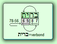 In deze volgorde hebben deze letters geen betekenis, maar als we ze in de volgorde 7-8-5-6 of 78-56 noteren, dan vinden we het woord 'berith', hetgeen verbond betekent. Let even op, de Hebreeuwse schrijfrichting is van rechts naar links: Is het reëel om dit zo te interpreteren? Om hier een antwoord op te kunnen geven zoeken we Heb.7:22 op: