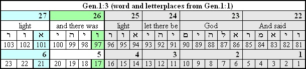 As far as I know these are the only two words, without mentioning the first word of course, that from the beginning of the bible text start on their own prime. Therefore the ‘light’ is the third word that starts on its own prime. An other important fact is that the ‘light’, the 6th word in verse three, starts on the 21st letter, its own triangular number: 1+2+3+4+5+6=21 We can realize that the sum