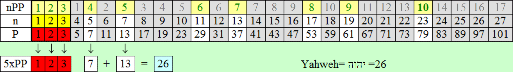 home 2005 7. The prime table. Primes are the smallest divisors of whole numbers. It will be clear that the factors 37 and 73 of Gen.1:1 are primes. The definition of these numbers is: “Prime numbers are numbers that can be divided only by themselves and/or one.” Mathematicians consider one not to be a prime, because 1 has only one divisor. I think the bible writers do see one as a prime, for they divided the natural numbers in primes and in composites, and one is definitely not a composite! I call primes numbers that cannot ‘lie’. This is because they can only represent themselves (or one). Their divisor is unchangeable. They are ‘good’, nor ‘bad’, but they can't deny what they represent. Here is the table with the first 27 prime numbers (P) and their numerical places (n).