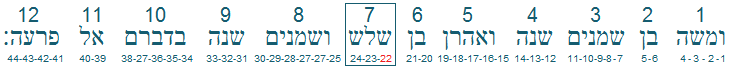 het vers wordt de beginletter van het woord ‘wetten’, 1 – 5 – 7 – 9 –11 – 14 – 28 – 33 – 36 – 40 De som van die letterplaatsen is 7+14+28=49, hetgeen 7x7 is. De