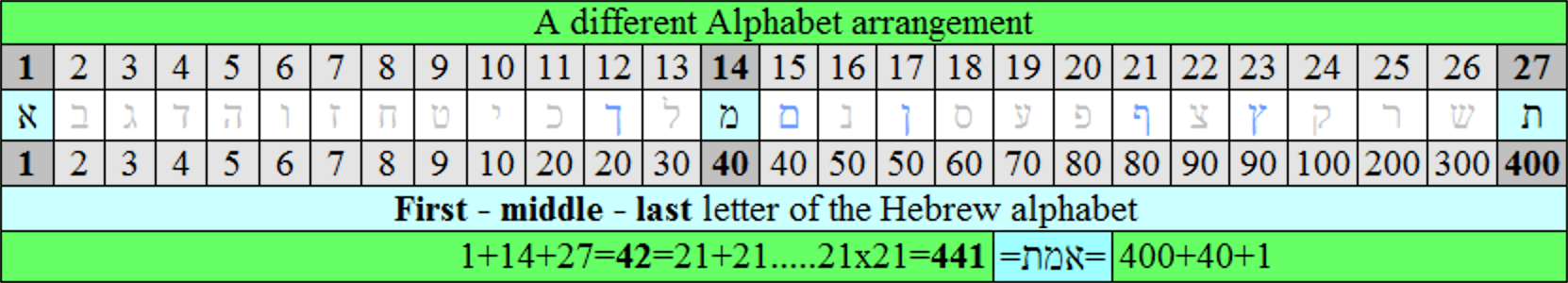 I think that it is clear now to the reader that the truth, 441, fixes the letter position of the central letter in the Torah, and with that also the total number of letters of these five books. We can not be sure if the bible writer was aware of this fact. It might have been divine inspiration, but it can also be a control method to keep the text clean and complete. Researchers that use scriptures with a different amount of letters have to consider whether they use the right writings or not. In most cases it will not make a big difference for the explanation of the texts. But for accurate research and research of the mathematical connections it does make a difference. So be warned and check out if your Torah text has 304805 letters. In Joh.14:6
