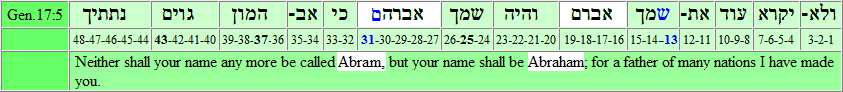 In the first instance the counting of the word places there seems to be nothing to this, but we should realize that there is something changed in the name of Abraham. God has added a hee, a 5, to his name. The hee sounds like a breath, but 10x the hee is after all 50. When we add this 50 to the sum of the word places, the result is: 2318+(10x5)=2368,
